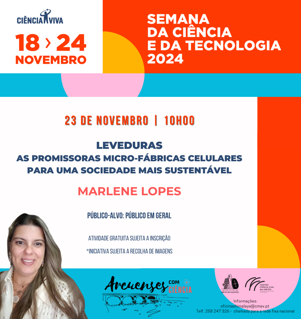 No dia 23 de novembro, pelas 10h00 horas, o Centro Ciência Viva dos Arcos - Oficinas de Criatividade Himalaya recebe a palestra intitulada “Leveduras: as promissoras micro-fábricas celulares para uma sociedade mais sustentável”, que terá como oradora Marlene Lopes, membro Integrado do Centro de Eng.ª Biológica e do Laboratório Associado LABBELS, Diretora Adjunta do Laboratório de Bioprocessos e Biossistemas, da Universidade do Minho.