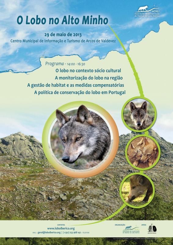 O colóquio "O lobo no Alto Minho" irá decorrer no próximo dia 29 de maio no Auditório do Centro Municipal de Informação e Turismo de Arcos de Valdevez pelas 14h00. Esta iniciativa tem como objetivo congregar representantes de várias entidades públicas e privadas que atuam na área de distribuição do lobo, de forma a promover a divulgação e discussão sobre vários aspetos relacionados com a conservação do lobo no Alto Minho.
