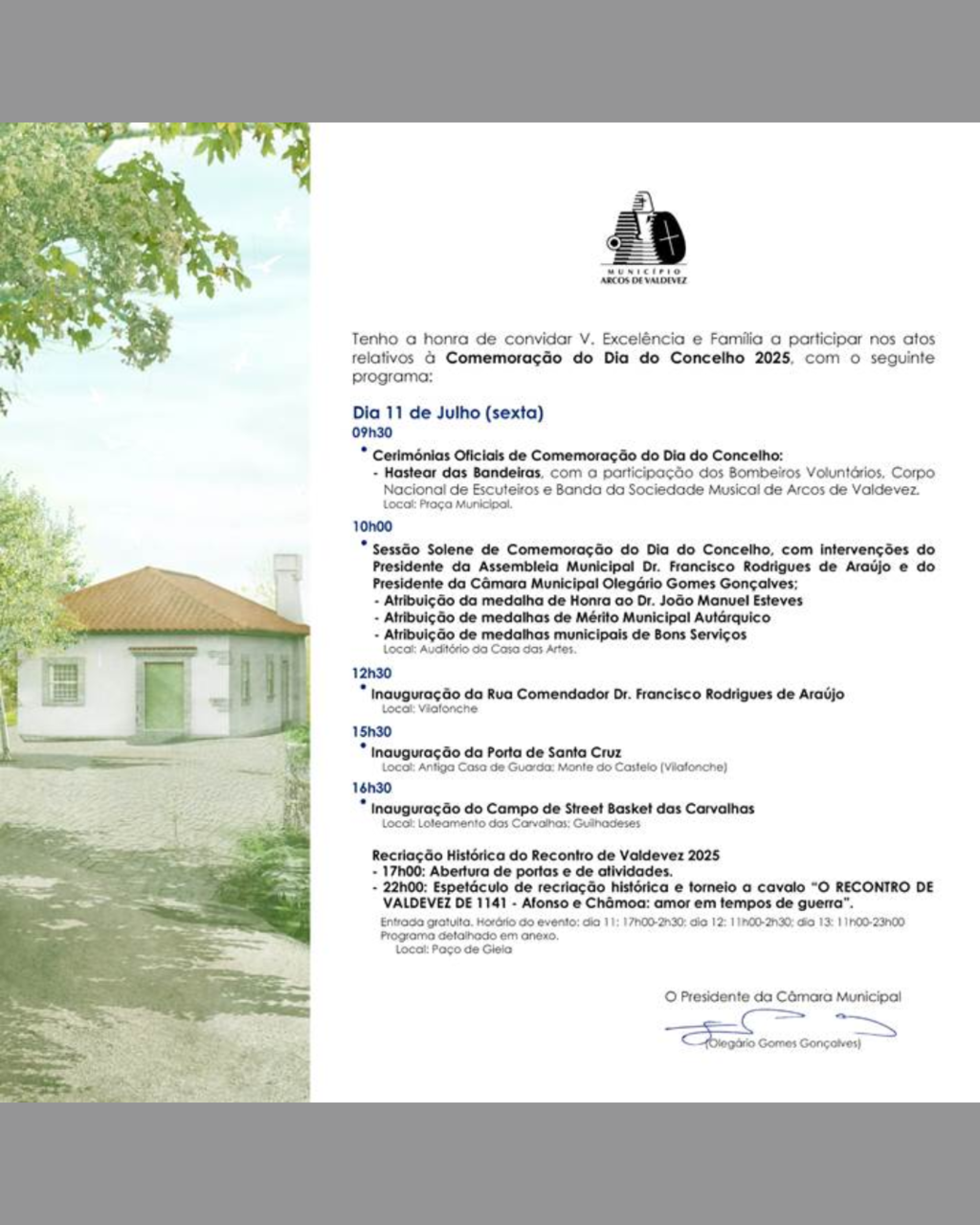 10h00: Sessão Solene de Comemoração do Dia do Concelho, com intervenções do Presidente da Assembleia Municipal Dr. Francisco Rodrigues Araújo e do Presidente da Câmara Municipal Olegário Gomes Gonçalves;