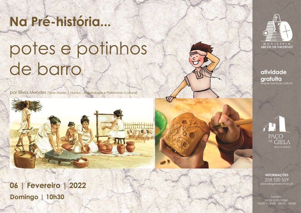 Fazendo uma viagem pela Pré-história, iremos conhecer as diferentes formas e decorações das peças em barro que o Homem criou há mais de cinco mil anos atrás. Com as próprias mãos e alguns instrumentos, vamos experimentar recriar o barro de então e moldar e decorar potes e potinhos, inspirados nos vestígios de outros tempos do concelho de Arcos de Valdevez e de Portugal.