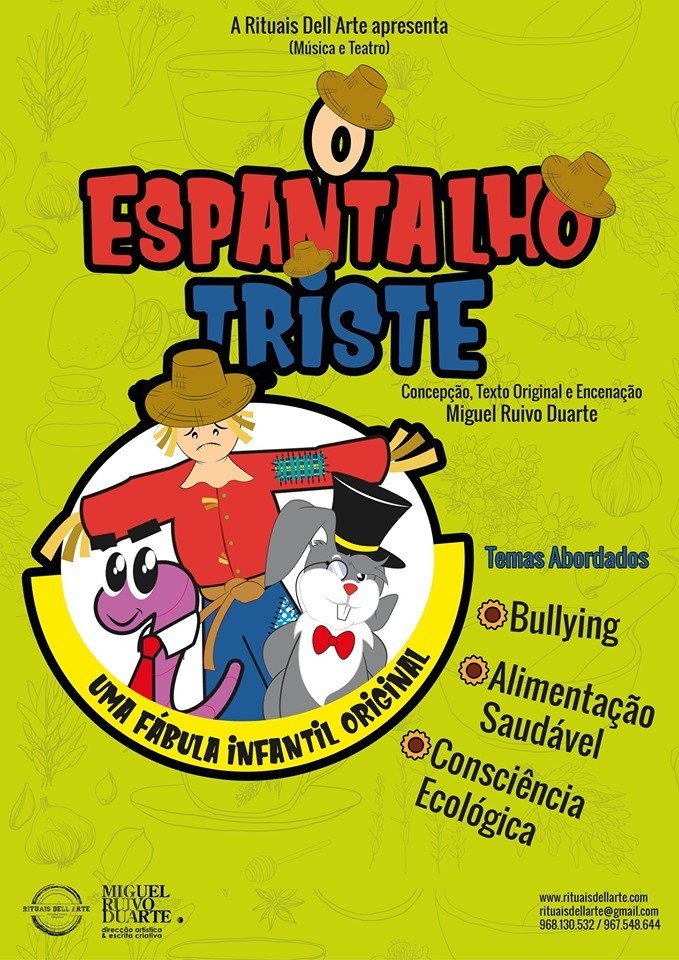 Estreia nacional deta nova produção; a fábula original da Companhia Rituais dell Arte, o ESPANTALHO TRISTE, um espetáculo para alertar comportamentos sobre a alimentação saudável, sobre as opções ecológicas e sobre o bullying.