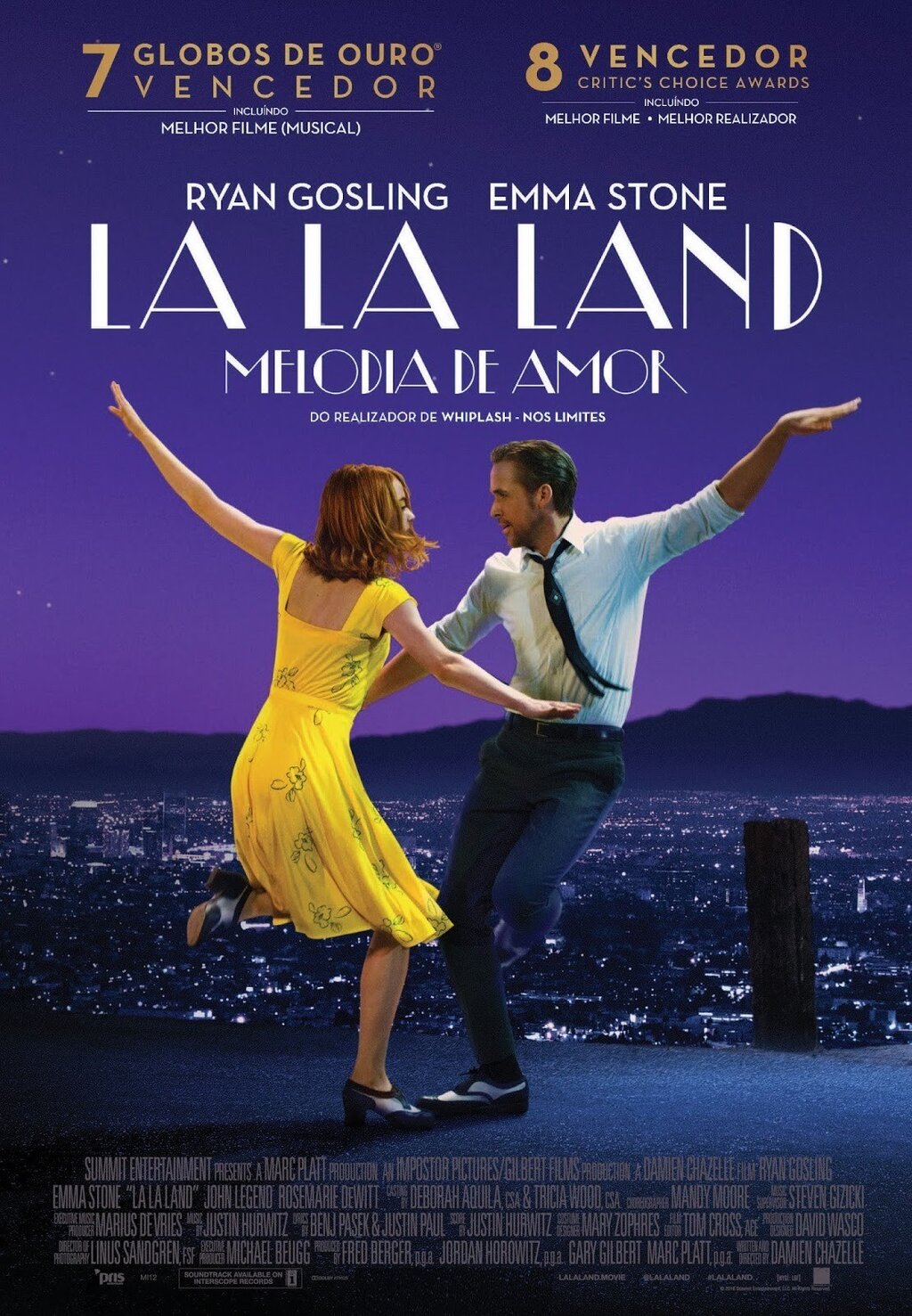Sinopse: O filme começa como tudo começa em Los Angeles: na auto-estrada. Este é o lugar onde o pianista de jazz Sebastian (Ryan Gosling), encontra a aspirante a atriz Mia (Emma Stone), com uma buzinadela de desdém num engarrafamento que espelha o impasse em que navegam as suas vidas. Ambos possuem o tipo de esperanças impossíveis que são a alma da cidade: Sebastian tenta fazer com as pessoas gostem de jazz tradicional no século XXI. Mia gostava de conseguir chegar ao fim de uma audição. Mas nenhum dos dois espera que o seu fatídico encontro os leve onde nunca poderiam chegar sozinhos. Os seus movimentos, em direção um do outro e para os seus grandiosos sonhos artísticos, criam um mundo próprio, essencialmente cinematográfico, em La La Land - que com luz, cor, som, música e palavras, viaja diretamente para os êxtases da felicidade que perseguimos... e ao sofrimento das paixões que nunca iremos superar.