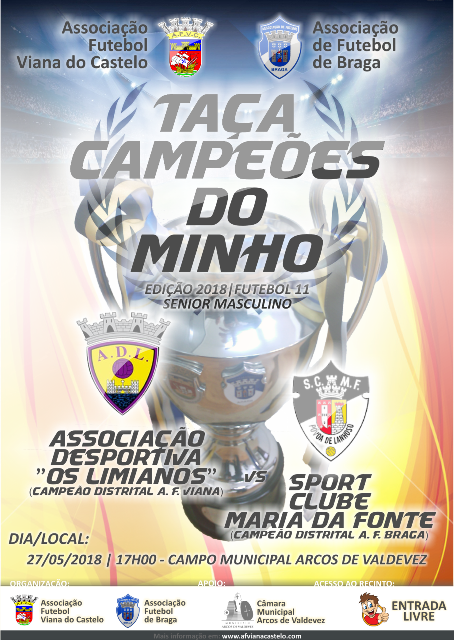 Terá lugar no dia 27 de maio, nas instalações desportivas do Campo Municipal da Coutada (relva natural), nos Arcos de Valdevez, o jogo da Final da Taça dos Campeões do Minho, entre as equipas da A.D. Os Limianos Campeões Distritais da A.F. Viana do Castelo na época de 2017/2018) e o S.C. Maria da Fonte (Campeão Distrital da A.F. Braga na época de 2017/2018), o qual tem o seu início marcado para as 17H00.
